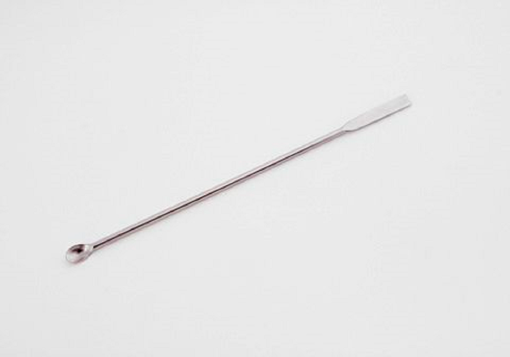 Uma extremidade com micro-colher, medindo 10 x 7mm e outra, plana, com acabamento reto, medindo 40 x 5mm;